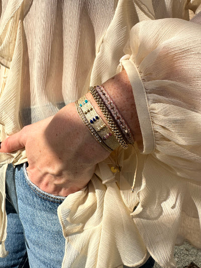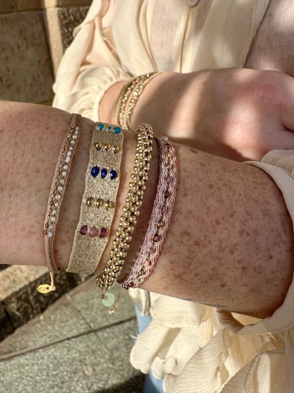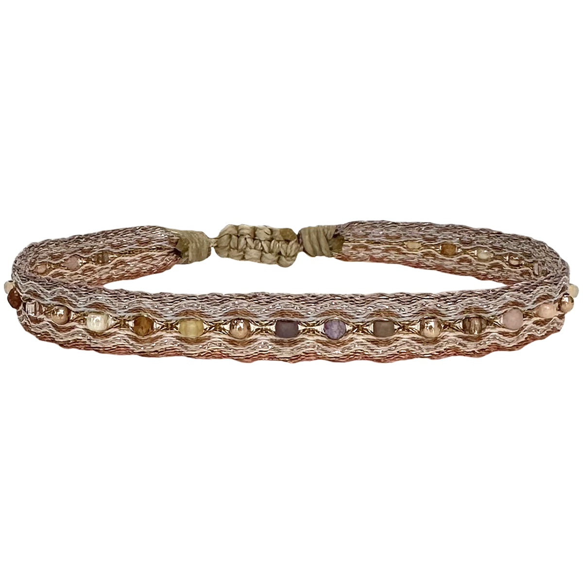 Visually stunning, this bracelet features polyester threads adorned with 14k rose gold filled beads, japanese glass beads & inter mixed semi precious stones. The craftsmanship and intricate details of this design will undoubtedly become an essential piece in you jewelry box.